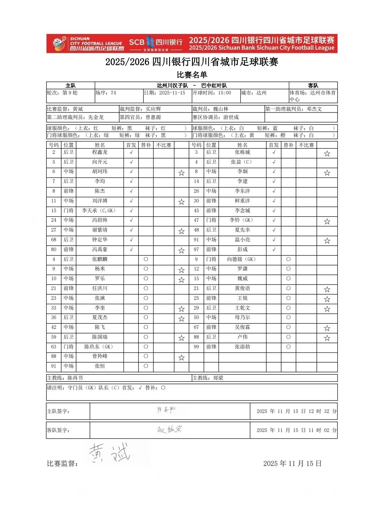11月15日15时,“川超”达州川汉子队VS巴中红叶队的较量,将在达州市体育中心打响。