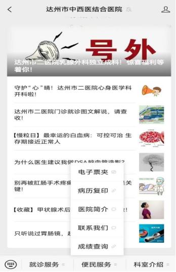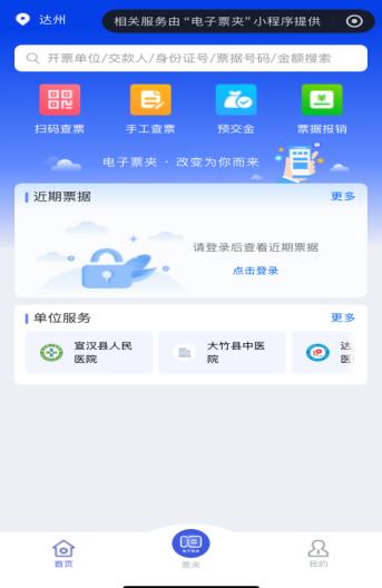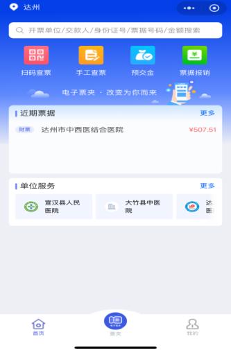 打开我院微信服务号“达州市中西医结合医院”,在首页底部的便民服务里选择“电子票夹”。