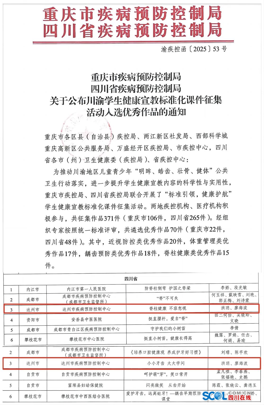 近日,重庆市、四川省疾病预防控制局通过对众多作品的层层遴选和评优,达州市疾控中心洪玥、廖海波的“脊柱健康不容忽视”“小小牙齿大大学问”2件作品,分别入选川渝学生健康宣教标准化课件脊柱健康类、龋齿预防类优秀作品。