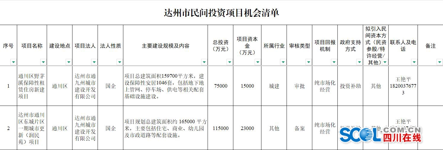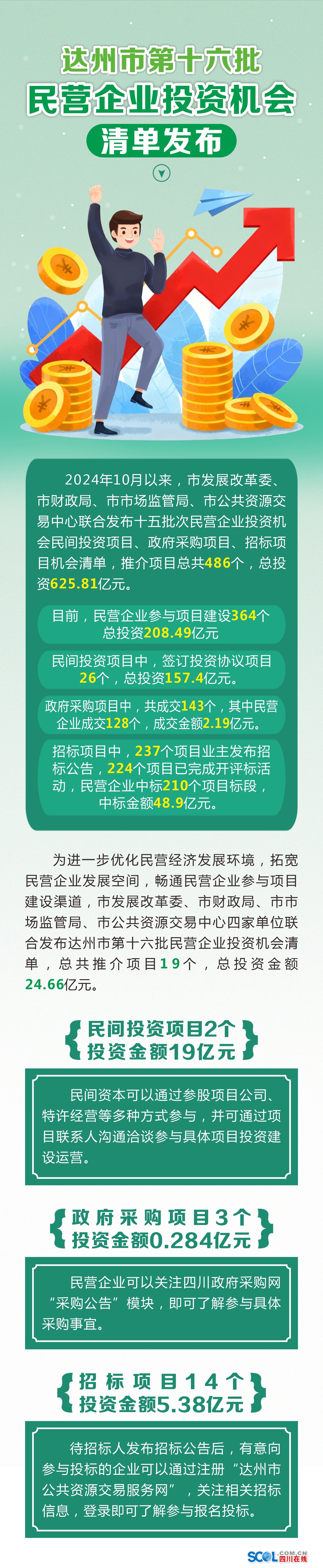2024年10月以来,达州市发展改革委、达州市财政局、达州市市场监管局、达州市公共资源交易中心联合发布十五批次民营企业投资机会民间投资项目、政府采购项目、招标项目机会清单,推介项目总共486个,总投资625.81亿元。
