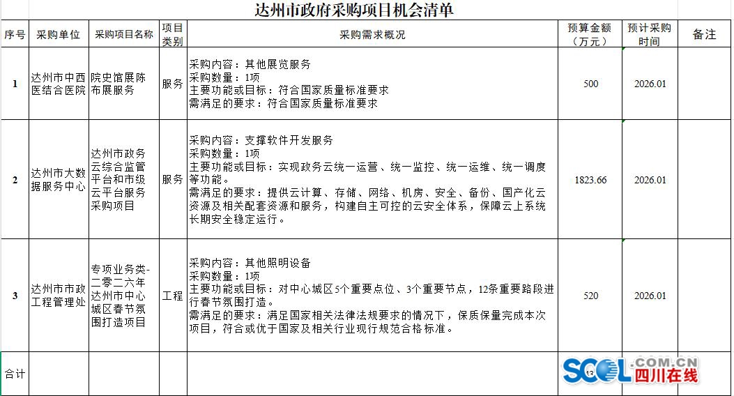 政府采购项目3个,投资金额0.284亿元。民营企业可以关注四川政府采购网“采购公告”模块,即可了解参与具体采购事宜。