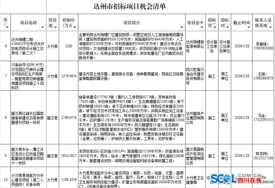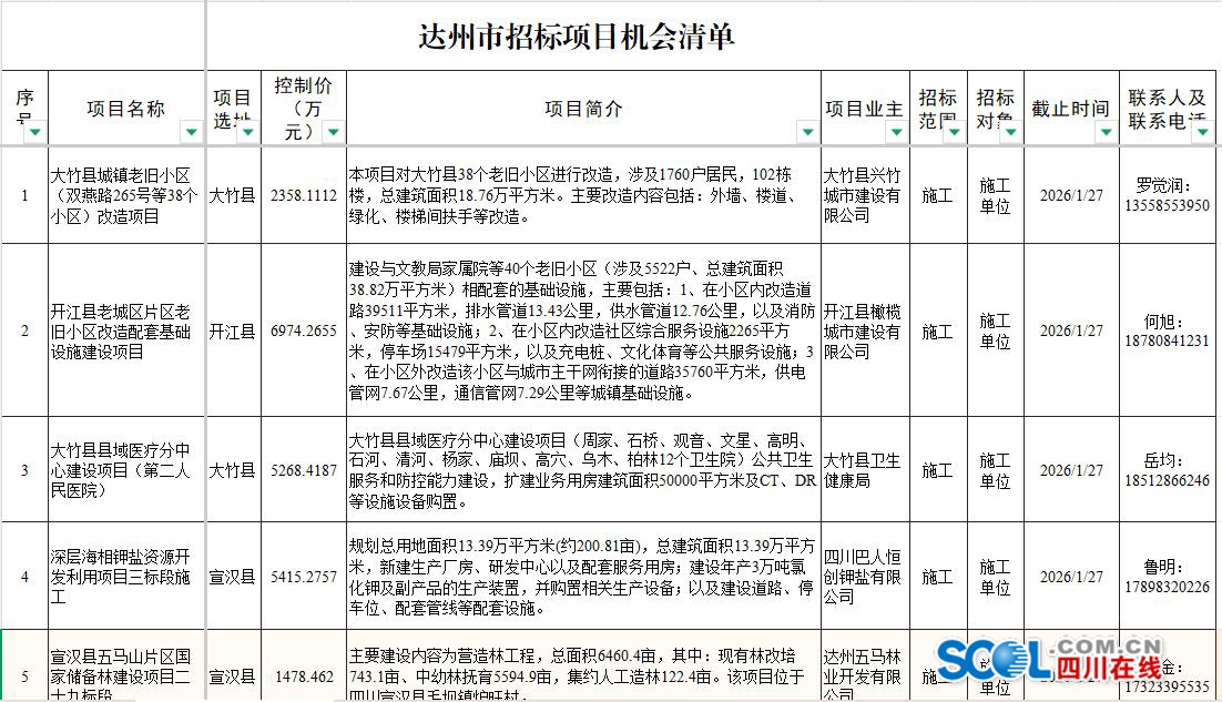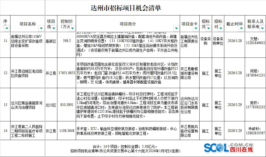 招标项目14个,投资金额5.38亿元。待招标人发布招标公告后,有意向参与投标的企业可以通过注册“达州市公共资源交易服务网”,关注相关招标信息,登录即可了解参与报名投标。