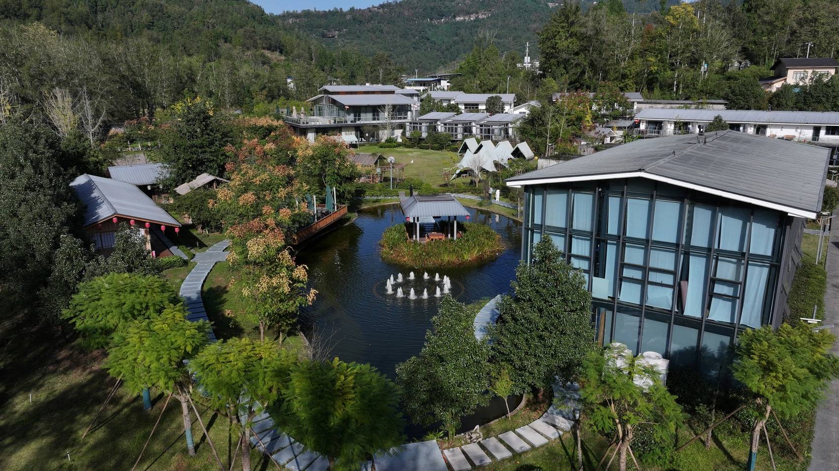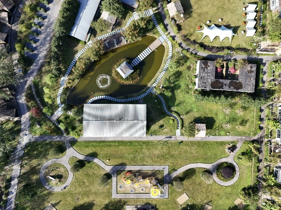 无人机从空中俯瞰,园区内的各种树木、藤蔓、花草相互交织,形成了一片独特的生态系统。