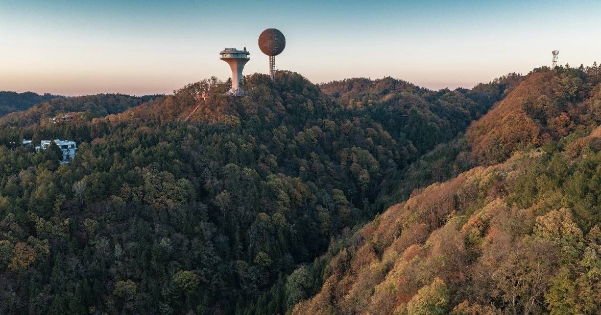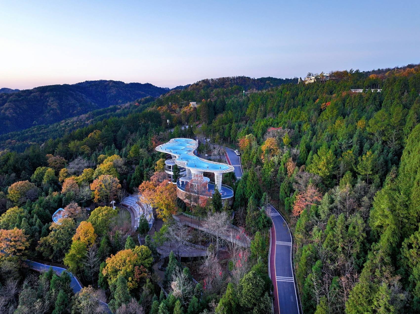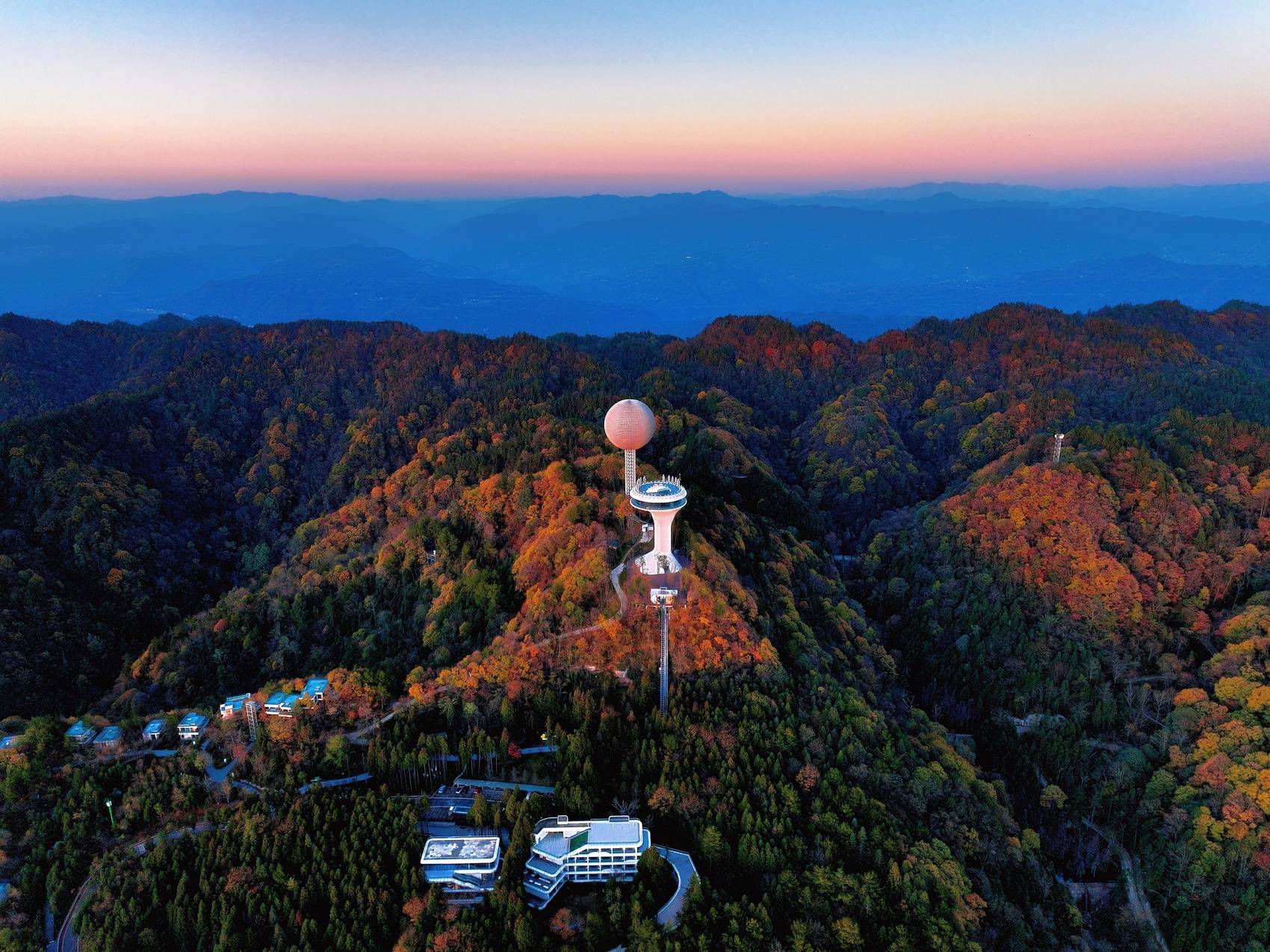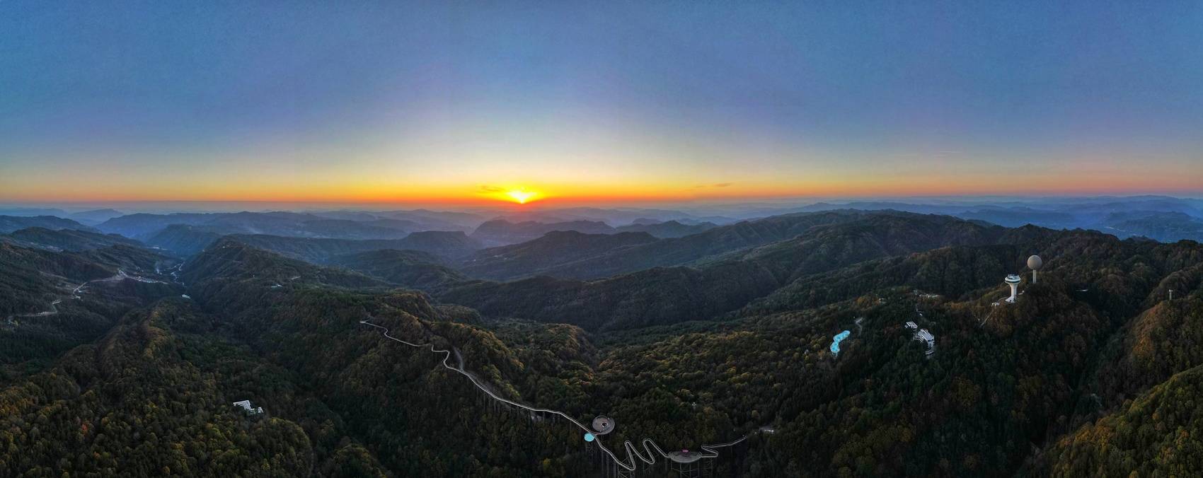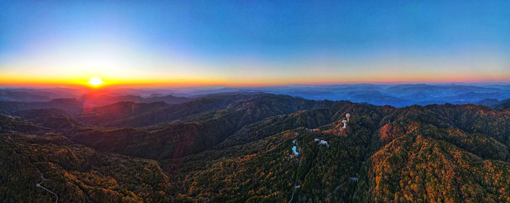 日落时分,在橘红色日光照耀下,景区内2万亩彩林格外耀眼,红枫、乌桕、银杏等林木褪去翠绿换上五彩盛装,宛如大自然打翻的调色盘,构成一幅独具浪漫的巴山初冬画卷。摄影师们登上海拔1520米的观景台将美景收入囊中。