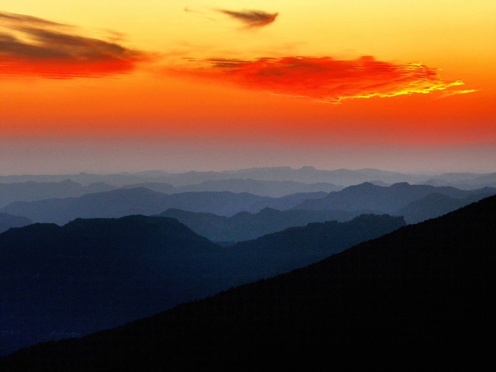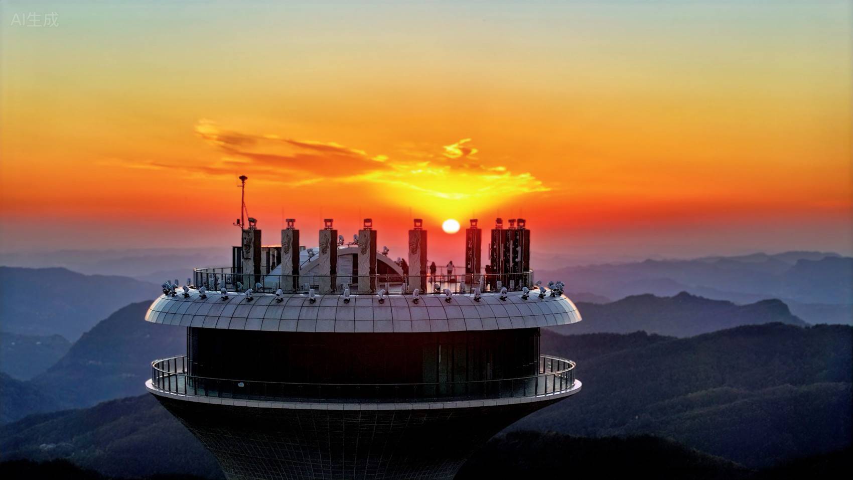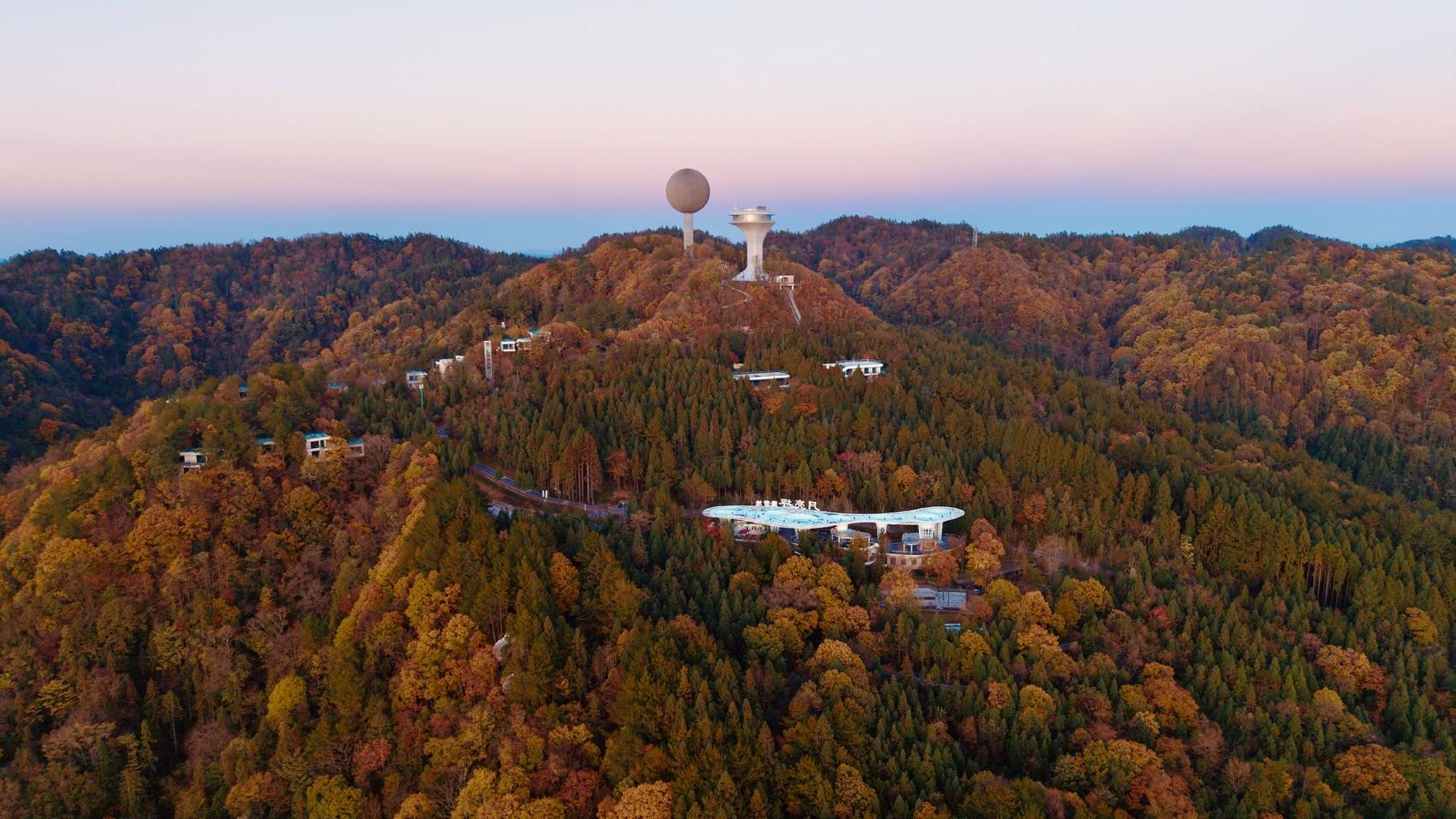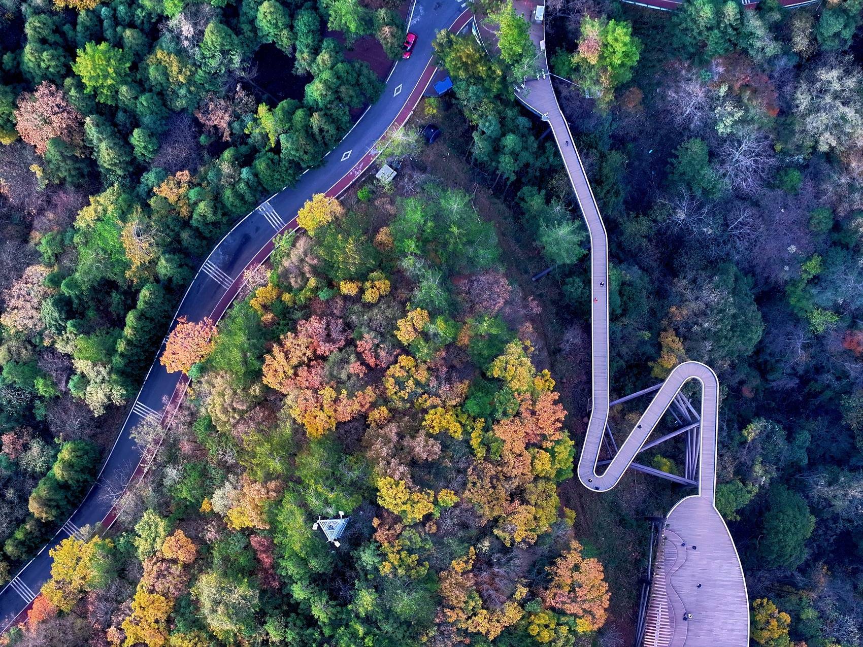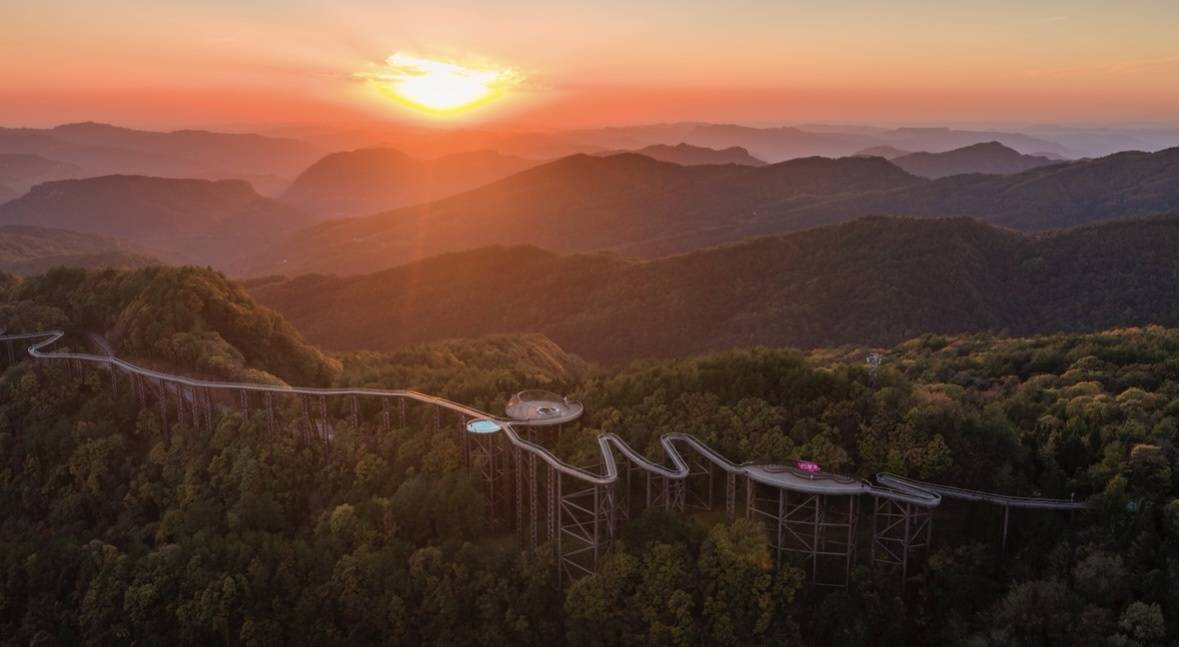 日落时分,在橘红色日光照耀下,景区内2万亩彩林格外耀眼,红枫、乌桕、银杏等林木褪去翠绿换上五彩盛装,宛如大自然打翻的调色盘,构成一幅独具浪漫的巴山初冬画卷。摄影师们登上海拔1520米的观景台将美景收入囊中。