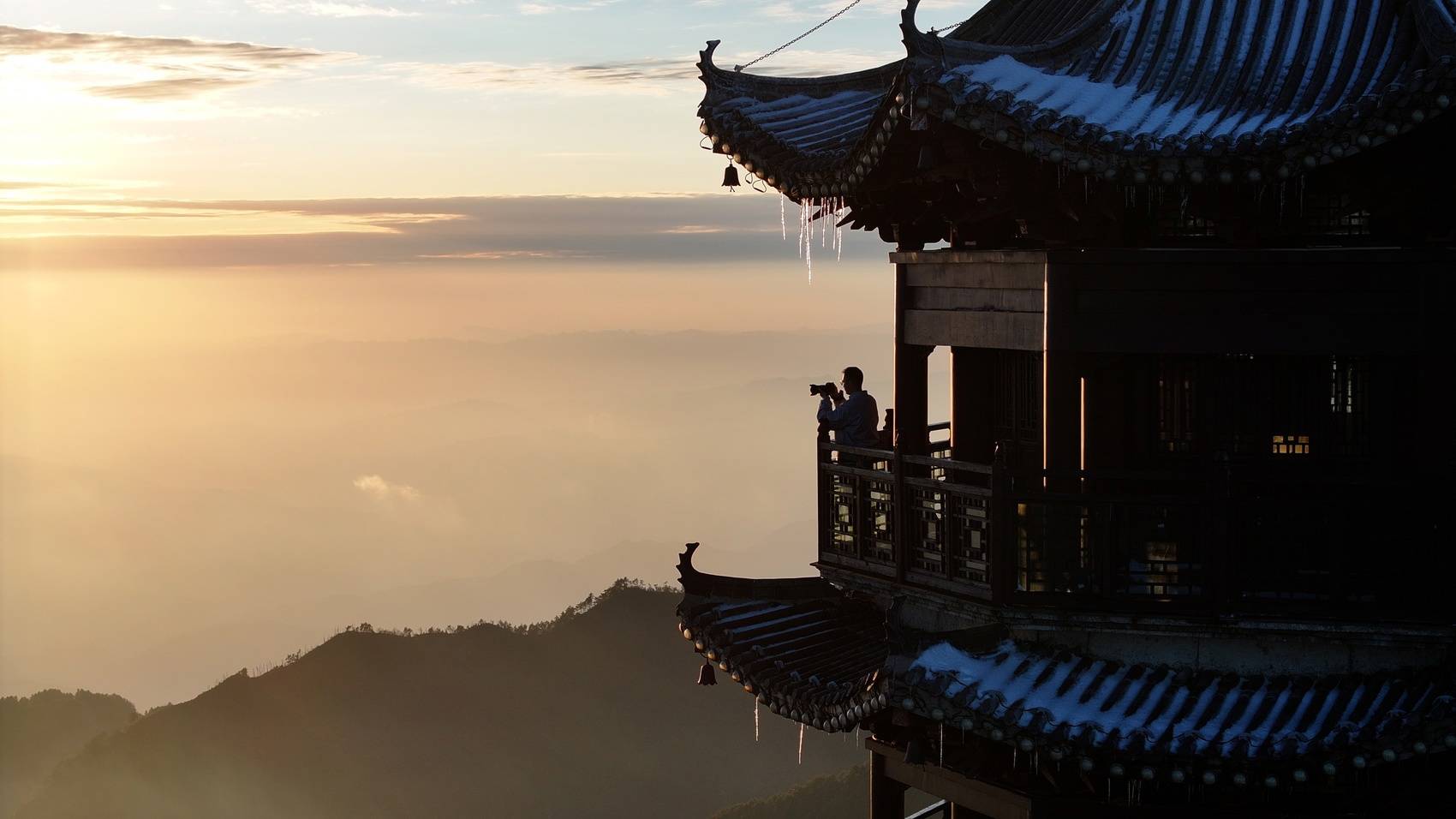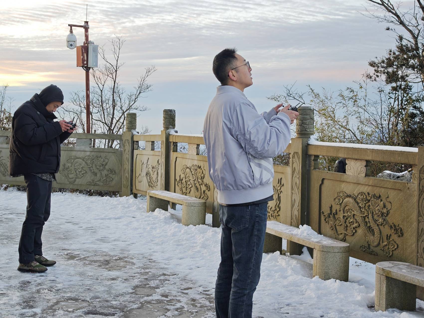 “快看!霞光上来了!”当瑰丽的晚霞终于铺展开来,雪景、古楼、彩林在金光与红霞中交织成“为霞尚满天”的诗意画卷时,现场瞬间兴奋。