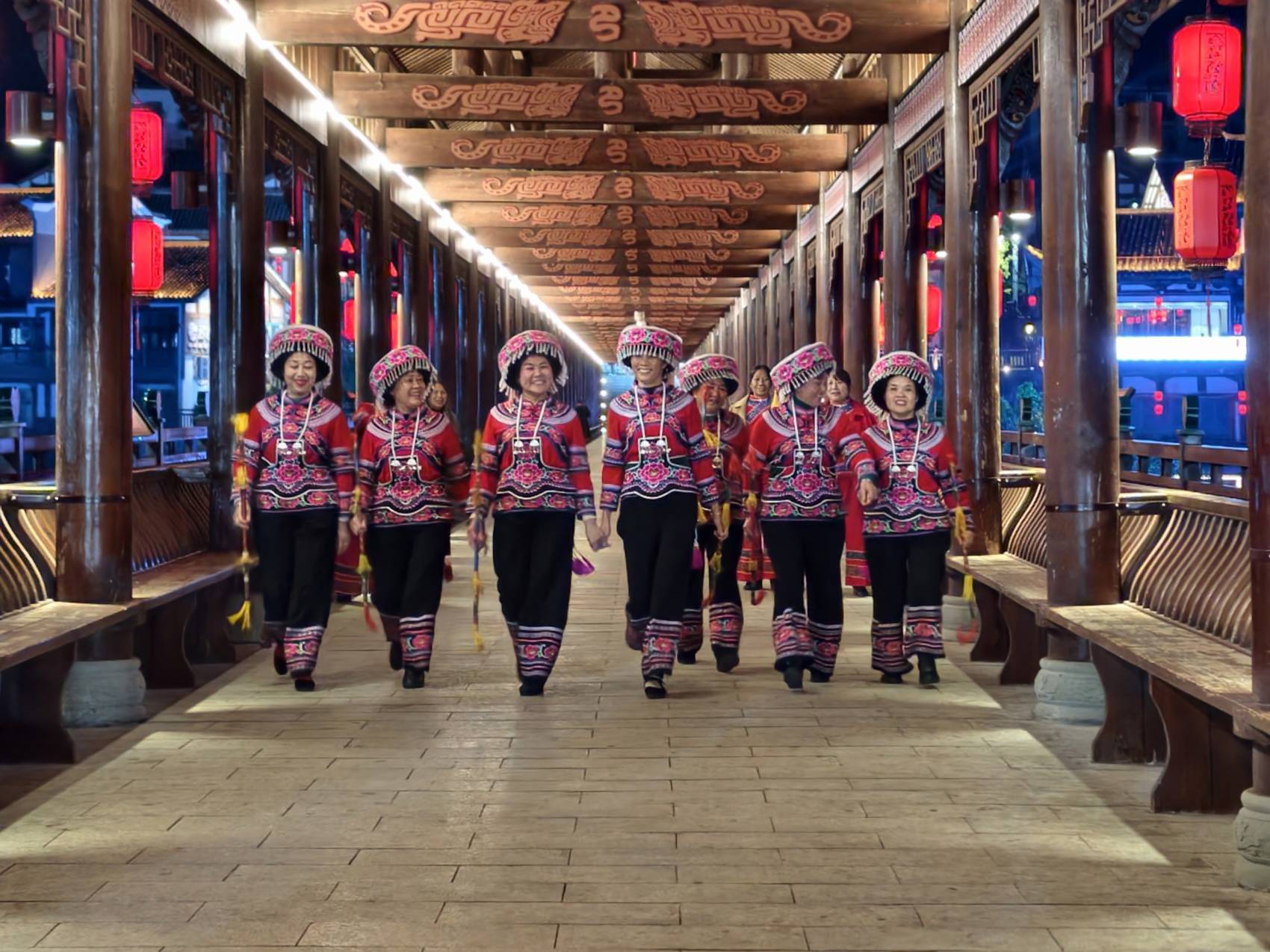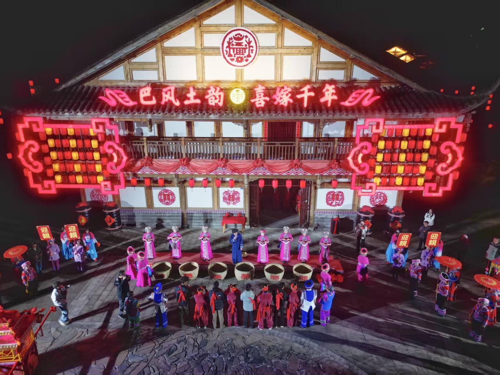 这场“巴风土韵・喜嫁千年”沉浸式巴山土家婚俗非遗秀以土家传统婚俗流程为主线,包括司锣开道引宾朋、青阶踏歌迎远客、廊桥欢歌接亲行、土家三关招佳婿、泪洒闺楼哭嫁情、支客司趣话逗新郎等10大篇章,让游客们深度体验当地丰富的民俗文化。