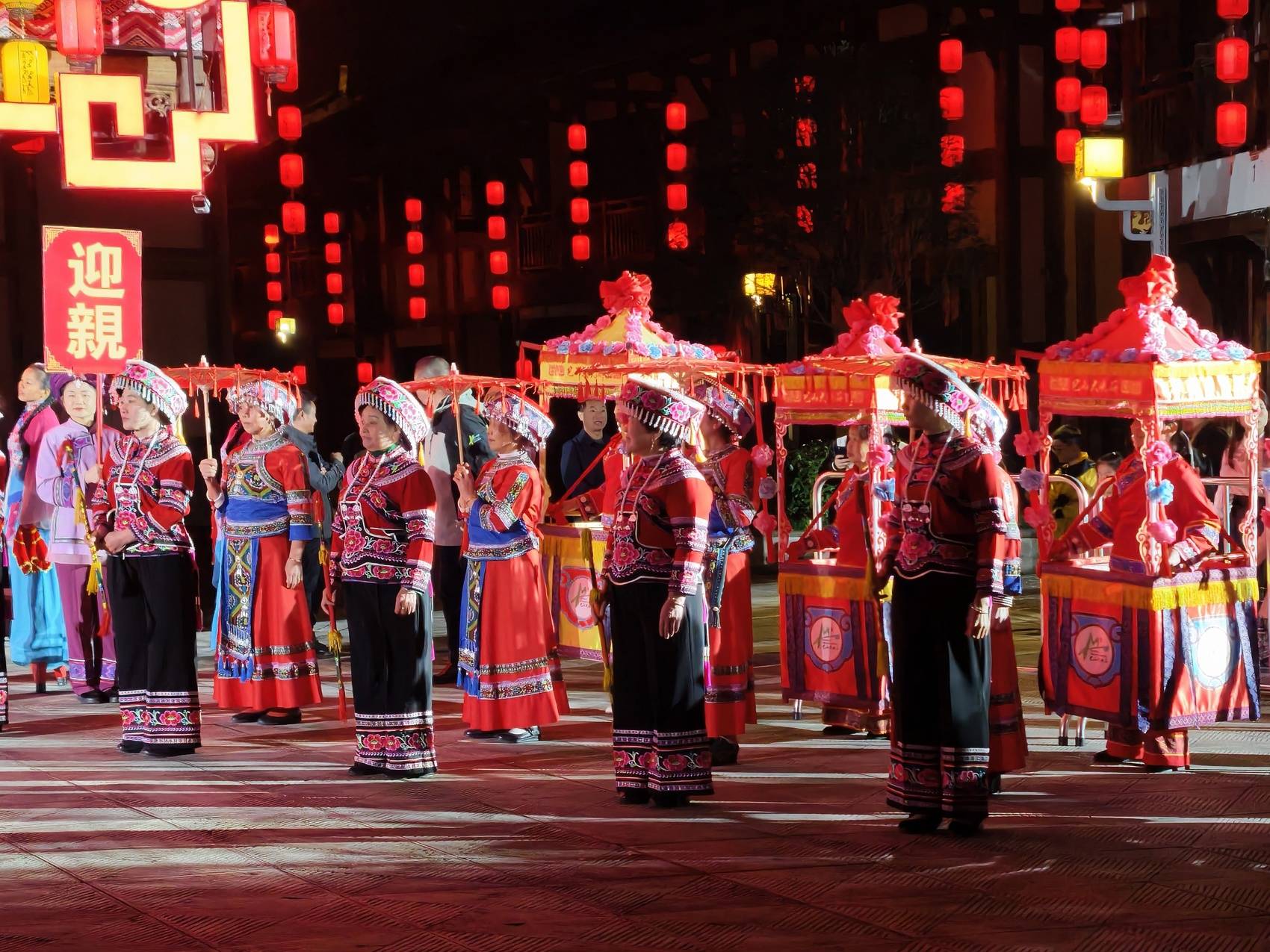 摄影师们穿梭于表演队伍中,奋力抓拍着这场古老婚俗的浪漫时刻。