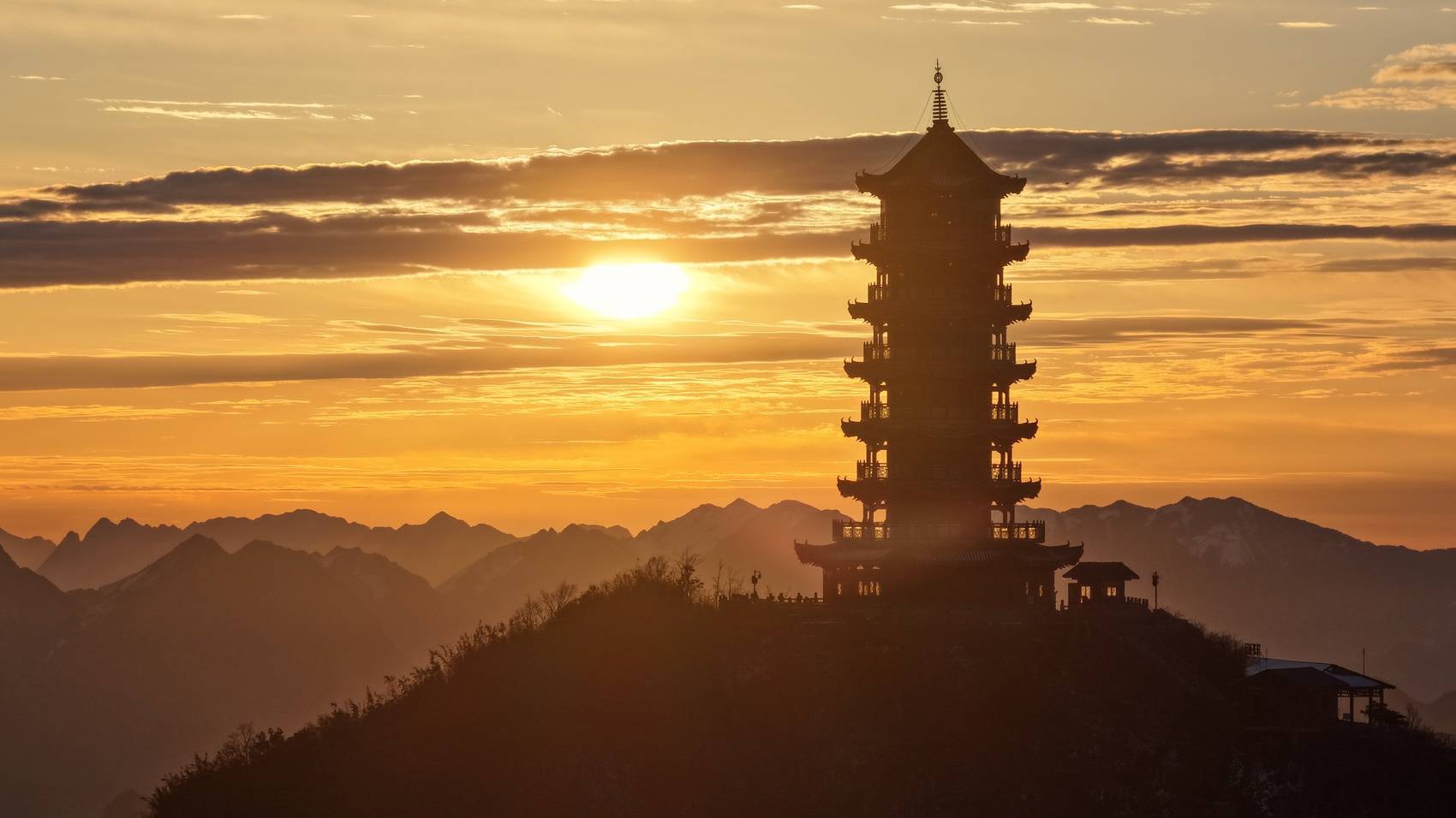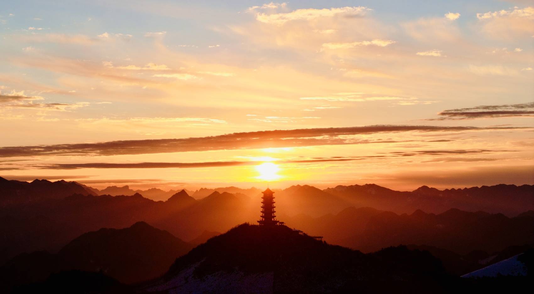 随着天际线由墨蓝逐渐转为鱼肚白,一道金色的细线悄然勾勒出远山的轮廓。突然,一束金光刺破云层,瞬间点燃了翻涌的云海,将其染成流金溢彩的熔岩之河。紧接着,太阳如同一个燃烧的火球,从云海边缘喷薄而出,跃上地平线,万丈光芒顷刻间洒满整个罗盘顶。