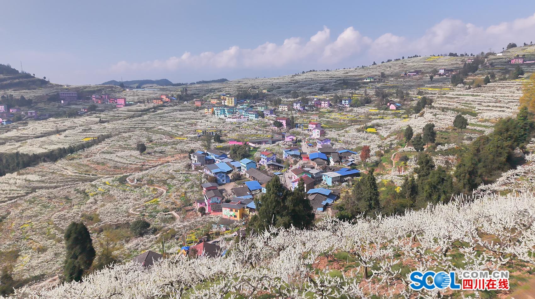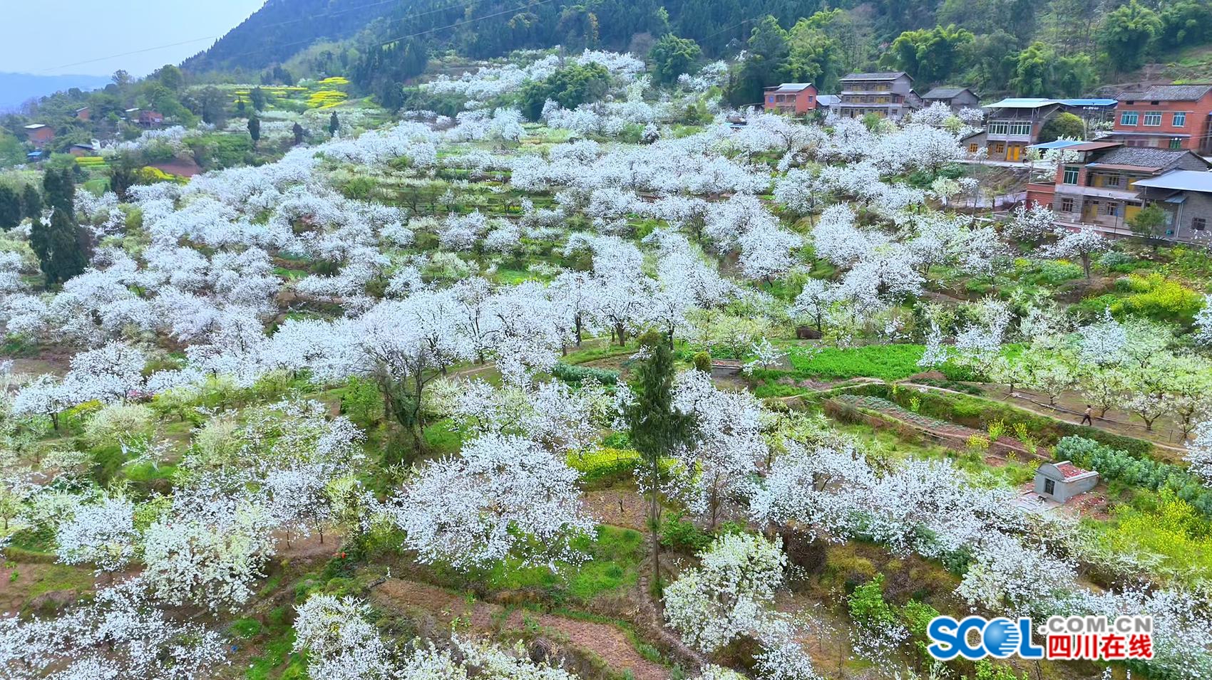 金色油菜花铺满田畴与梯田,随风翻涌成浪;洁白李花、梨花缀满枝头,如云似雪,点缀山间村落。金黄与素白相映,一步一景、处处入画,吸引市民游客踏青赏花、拍照打卡。