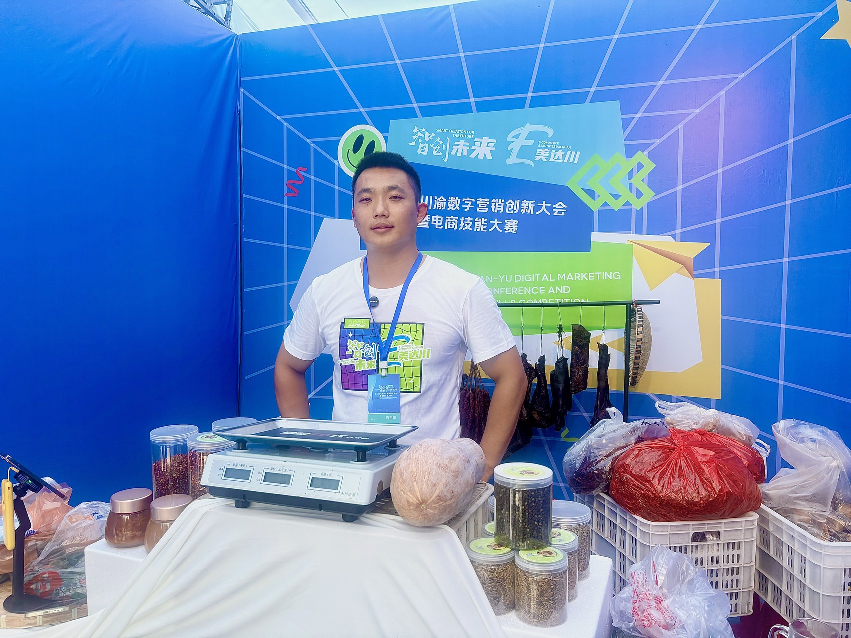 “排骨香肠已经售完,下面再给大家上一个来自我们镇上的农家自制香肠。”走进来自达州市达川区赵家镇的罗豆的直播间,他正在向线上观众推介着当地农家自制腊味食品。作为带货组主播,罗豆带来的产品不仅有烟熏制品,还有当地的花椒、辣椒、南瓜等各种农产品。“压力还是挺大的,因为评分标准不仅要看是否带有当地特色元素,还得看成交量和主播表现力。”尽管嘴上说着难,但罗豆开播后便迅速进入主播状态,卖力地介绍着所卖产品。