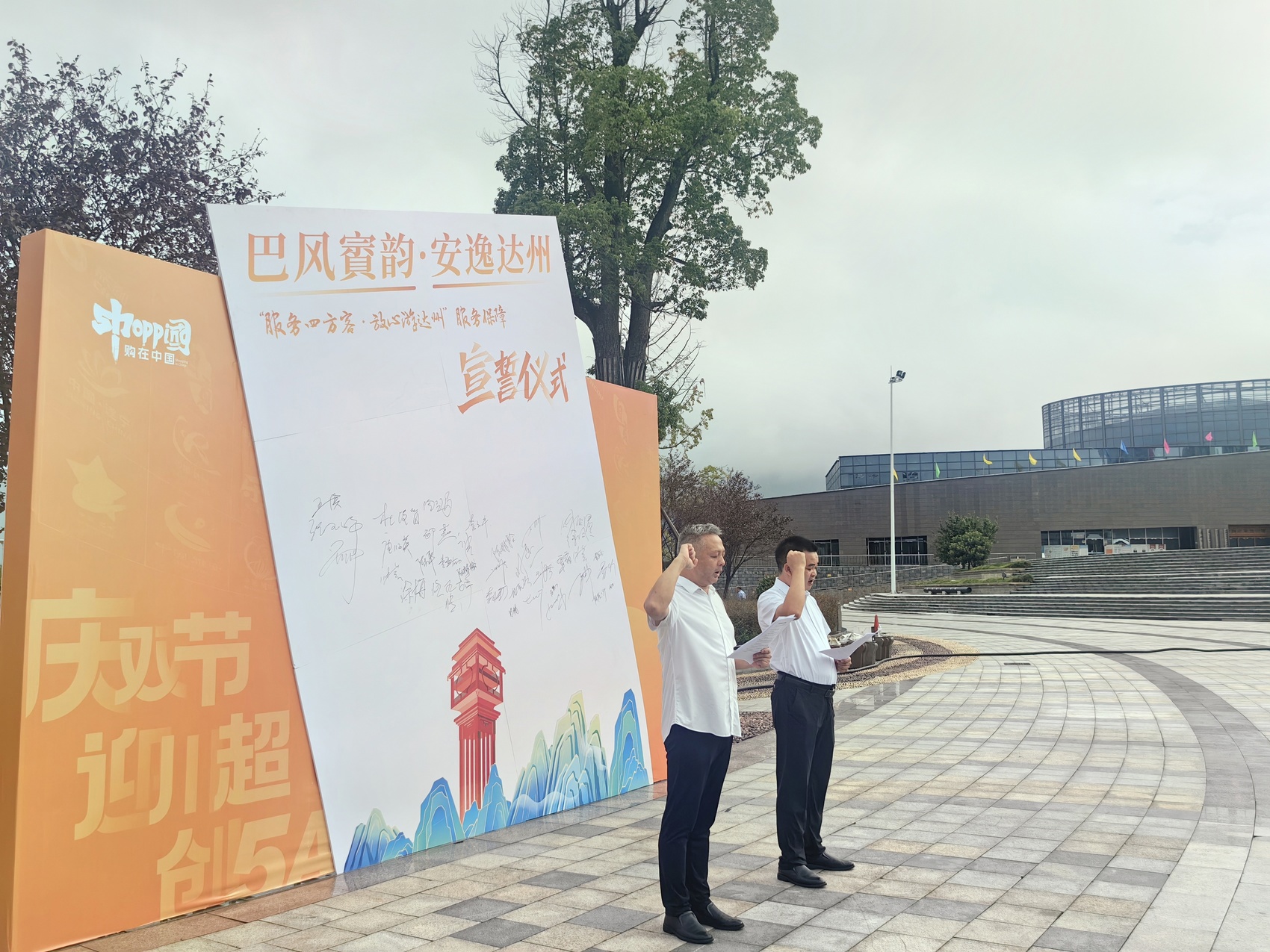 “让每一位游客‘吃得放心、住得舒心、玩得开心’庆双节,迎川超,创5A,服务有我!”9月27日,“巴风賨韵·安逸达州——服务四方客·放心游达州”服务保障宣誓仪式在达州市莲花湖畔巴山大剧院前广场举行。当天,来自达州中心城区的100家餐饮、酒店企业代表在行业协会负责人的带领下庄严宣誓。