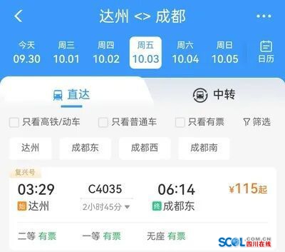 10月3日,达州至成都东加开C4035次列车,达州03:29开,06:14终到成都东。