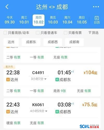 10月2日,达州至成都东加开C4491次列车,达州22:38始发,3日01:45终到成都东。