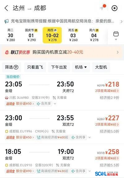 10月2日,成航执飞的成都双流—达州金垭EU1995次航班,成都起飞时间为20:05;达州金垭—成都双流EU1996次航班,达州起飞时间为23:00。