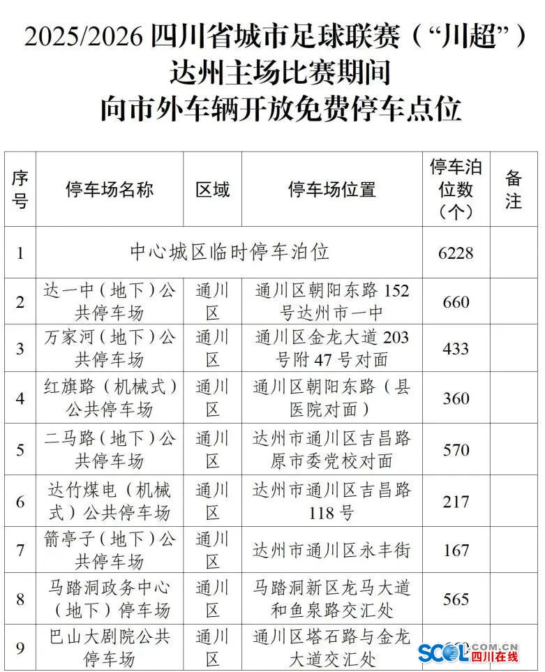 为迎接八方来客,“川超”达州主场比赛期间,向达州市外牌照车辆免费停车,达州主场比赛当天及前后一天(共三天)。