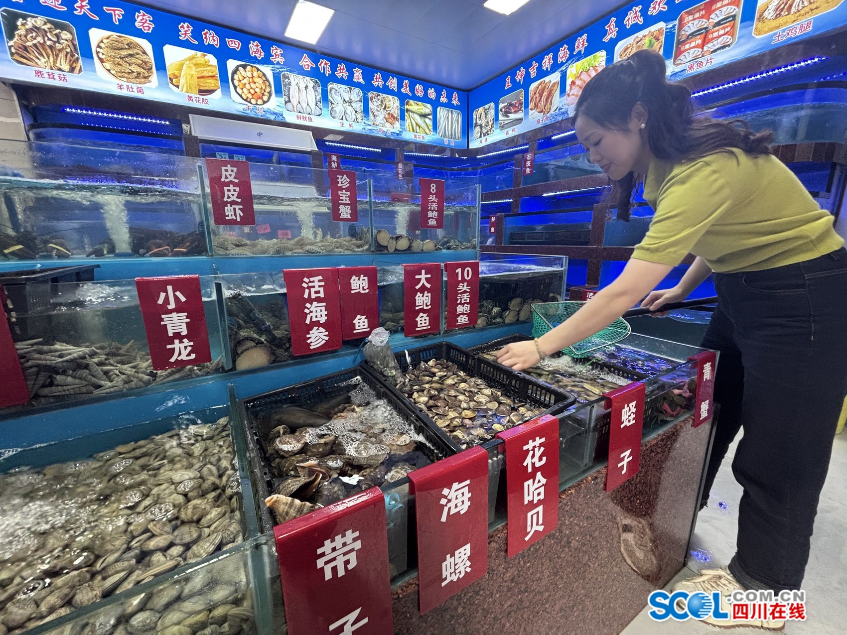 “罗氏虾59.8一斤,大海螺35.9一斤,团购价格很实惠。”国庆假期,在达州市通川区朝阳农贸集市经营着一家海鲜批发店的店主王淑秀所开设的网络平台账号正进行线上直播。