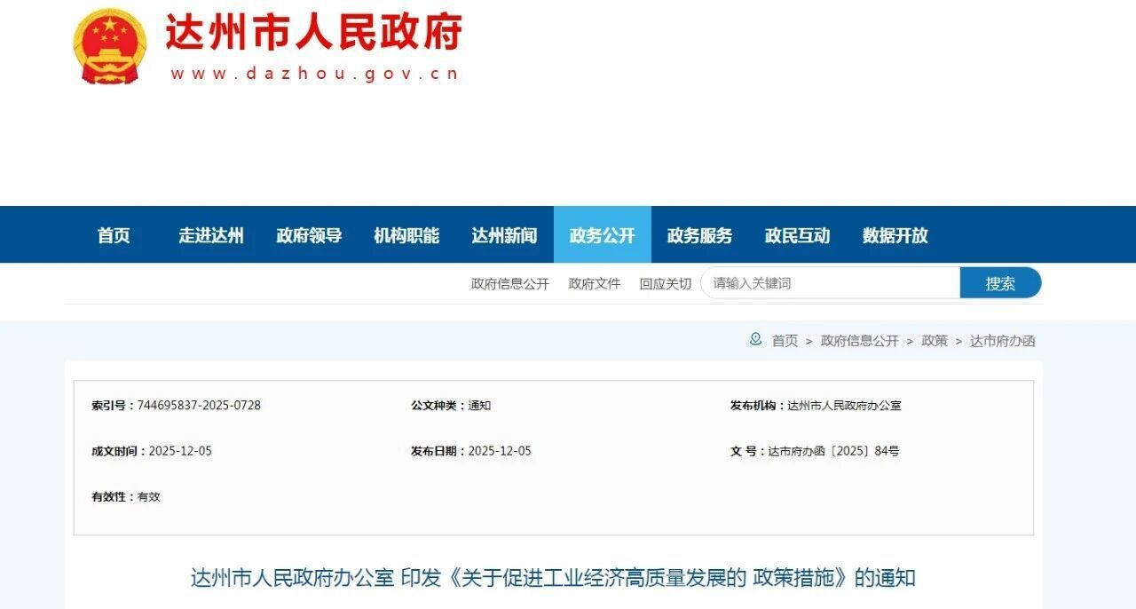 近日,达州市印发《关于促进工业经济高质量发展的政策措施》(以下简称《措施》),推出六方面二十七条具体举措,以“真金白银”激励工业企业做大做强、转型升级。《措施》自2025年4月1日起施行,有效期至2027年3月31日。