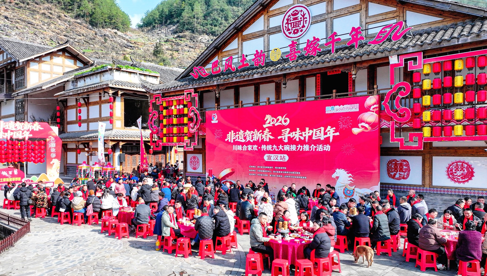 2月10日,达州市宣汉县渡口土家族乡风情街,“跟着美食游四川”宣汉站活动热闹举行,在一桌桌热气蒸腾的土家传统宴席中,当地群众、四方游客共同解锁川东地道美味。