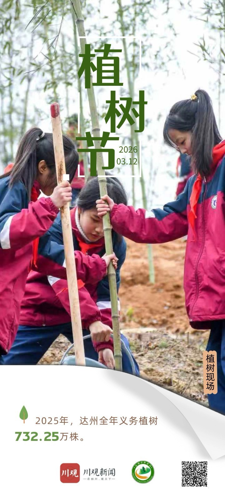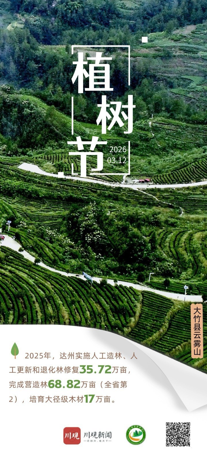 3月12日是植树节。据达州市林业局统计数据显示,2025年,达州全年义务植树732.25万株,实施人工造林、人工更新和退化林修复35.72万亩,完成营造林68.82万亩(全省第二),培育大径级木材17万亩。