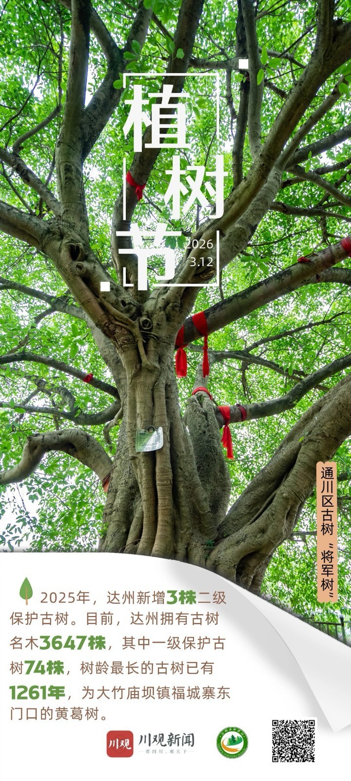 同年,达州新增3株二级保护古树。至此,达州拥有古树名木3647株,其中一级保护古树74株、二级保护古树314株、三级保护古树3259株,树龄最长的古树已有1261年,为大竹庙坝镇福城寨东门口的黄葛树。
